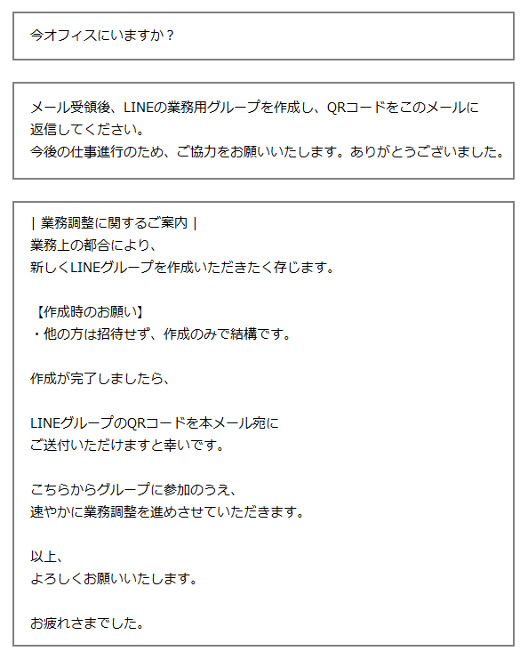 不審なメールを受信された場合は、返信やLINEグループの作成、記載されたURLへのアクセス、添付ファイルの開封等は行わず、すみやかに削除していただきますようお願いいたします。